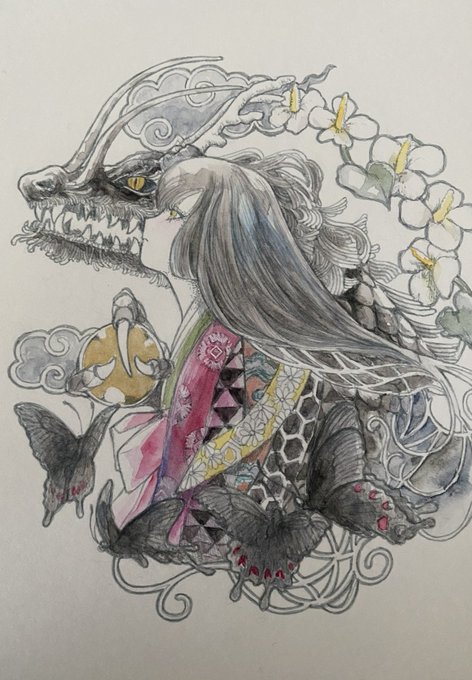 「犠牲」 モチーフ黒姫物語。容姿端麗な黒姫様に蛇だったり小姓だったり蝶だったりに化けた黒龍がストー……結婚を申し込むけど偉い人に邪魔されてめちゃ激怒で嵐を起こしたりしちゃうもんだから黒姫様が黒龍の元へ行ってなんとか宥めてそのまま山の池に2人で住むことになりました。 #ペン画 #水彩画