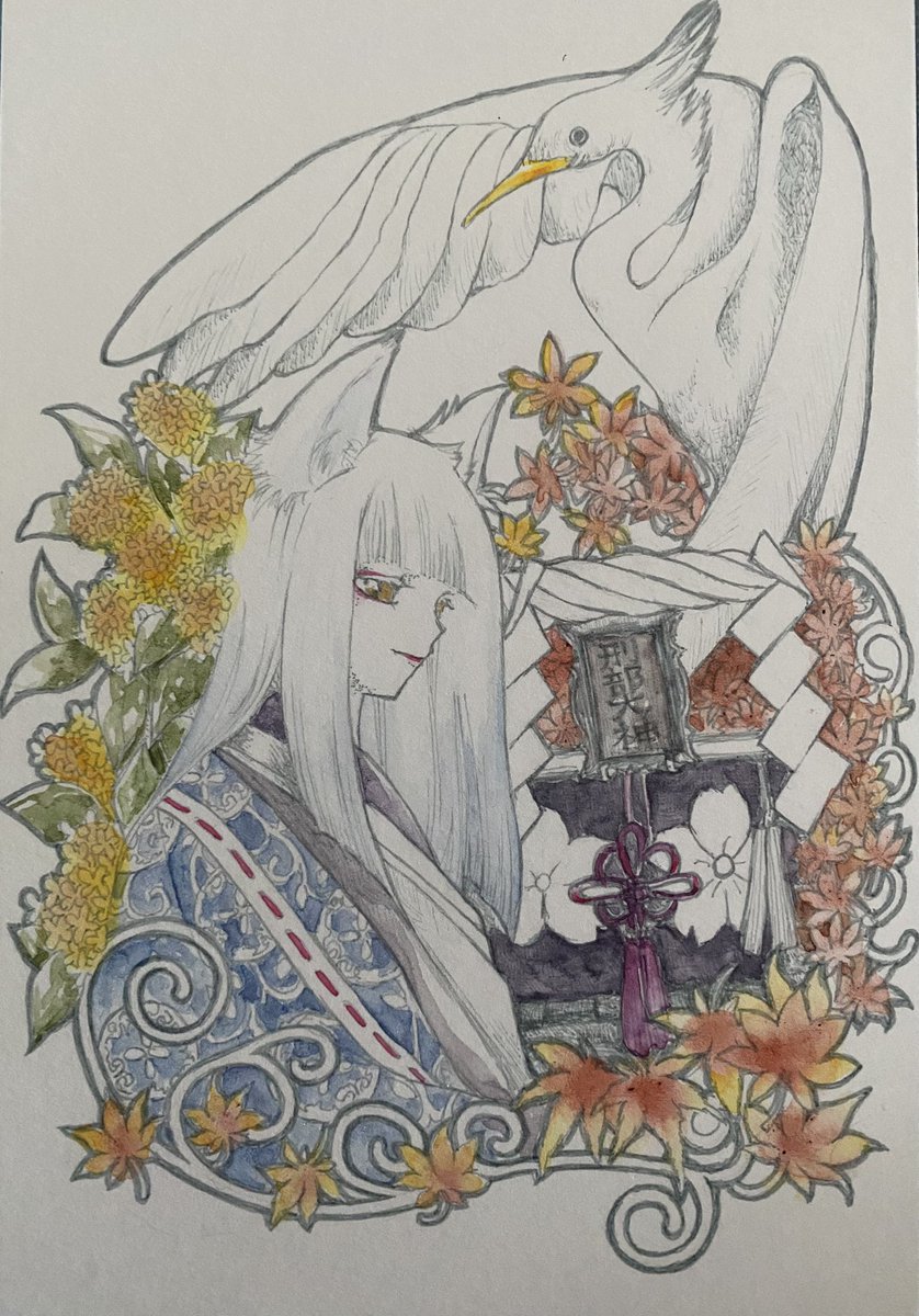 「気高い」 モチーフ刑部姫。古の姫神。姫路城(別名白鷺城)の天守閣にいて度胸試しで来た男の勇気に感心して生きて帰してやるけど人が来るところじゃないからね?と、無礼を許す寛大な心の持ち主でもある。一説には老狐とも言われている。 #ペン画 #水彩画 #透明水彩