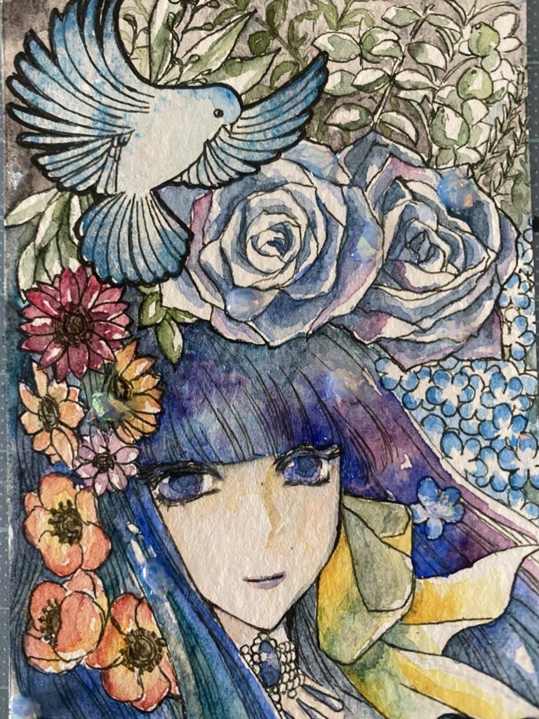 ヨリドリミドリ展に出した夜露ちゃん、描き直ししました。ちょっと顔が思った通りにならなく、しかし時間がなかったのでそのまま出したんだけど気になってたので。可愛く描けました😊 #小さい絵 #水彩画 #アナログ絵