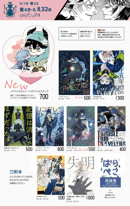 日曜日の春コミ参加します。いろいろプライベートがドタバタで、新しいものは先日写真UPしてたアクスタのみですが、イデマレアンソロのフライヤーも置きますので、ぜひぜひ貰いにいらしてください~!貰いに来るだけでも大丈夫です☺ ▼pixivで見る方はこちらから pixiv.net/artworks/10628…
