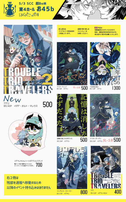 日曜日のインテ参加します。おしながきと、お菓子の余りとかポスターとかのお知らせです。 12月の新刊を再販かけたので持っていきます。一部在庫の手配を忘れまして…手持ち僅かになってます💦通販在庫はあります。 よろしくお願いします~! ▼pixivで見る方はこちら pixiv.net/artworks/10428…