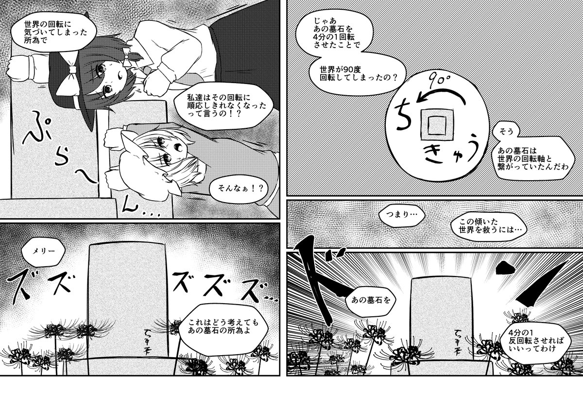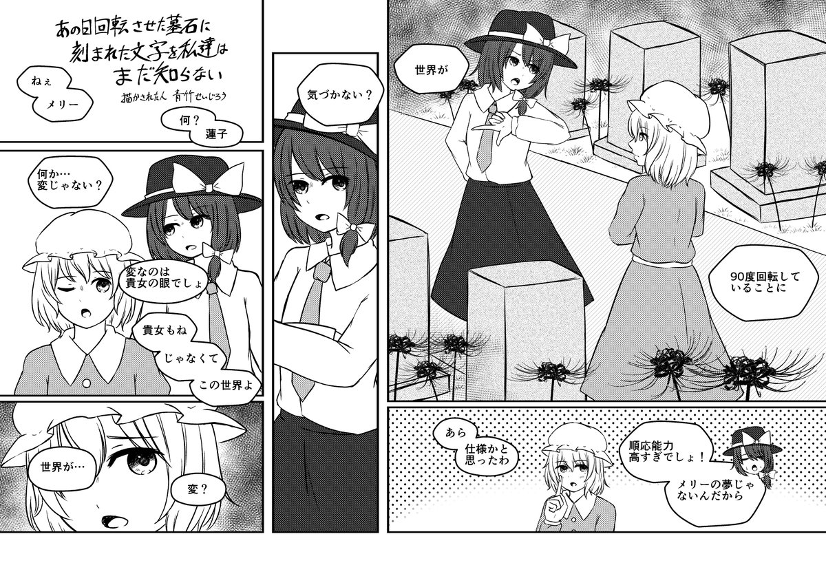 夏コミC102にて頒布されます合同誌 『墓石の回転祭 ~ 秘封プロット交換合同』に7ページほど描きました。 スペース「サ51b」 サークル「かさぶらん科!」 にて配布予定です! 墓石とかを回すお話です。がんばりました。よろしくな。