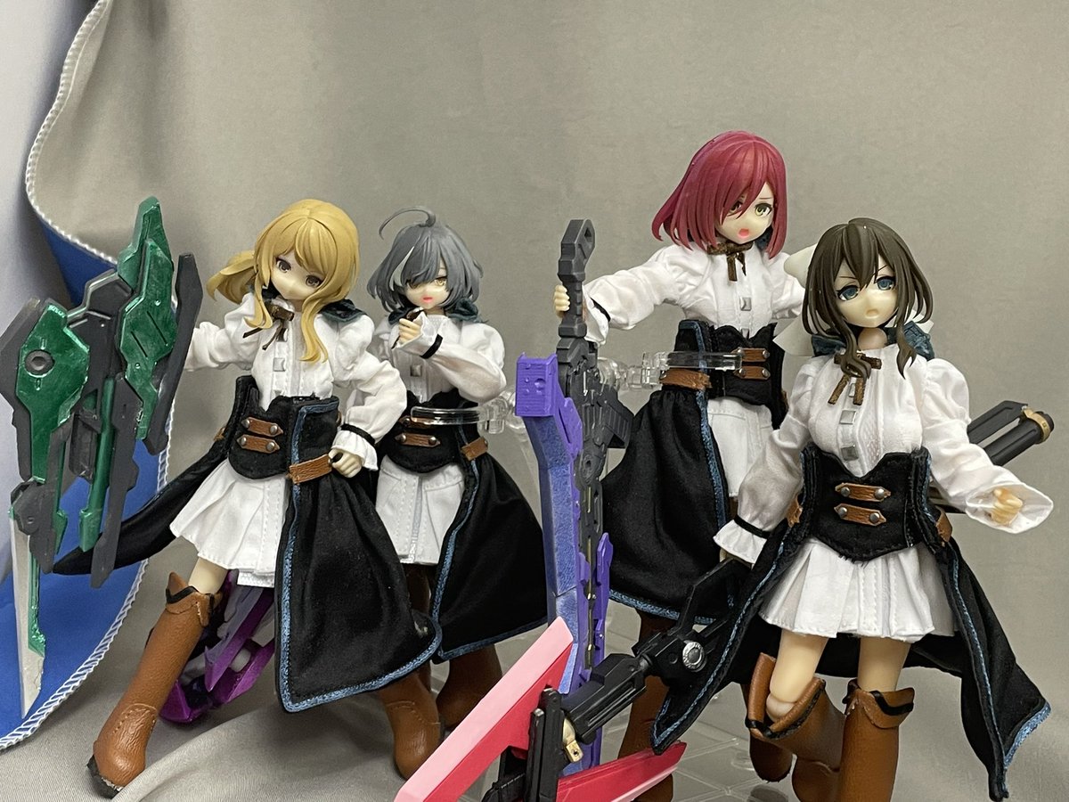 ACT-kNifeさん(@heppoco_seijin)のヘルヴォル集合! とりあえず一通り形にはしたけどまだフェイスパーツのマグネット固定とかゲイボルグのシューティング固定とかブルンツヴィークの変形機構とかやること山積みだ #アサルトリリィ #アサルトリリィドール部 #アサルトリリィCHARM部