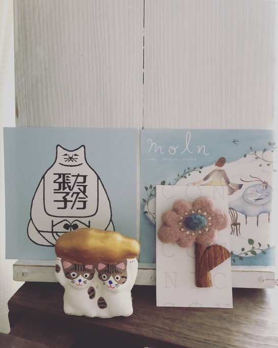 0 1 鎌倉「moln」さんでNICOさんのブローチとかまくら張子さんの招き猫を入手してきました。NICOさんのブローチコレクションがまた一つ増えました。右手と左手それぞれ上げている2匹の猫と金色の雲(moln)。めでたい! #鎌倉 #moln #NICO #羊毛フェルト #花ブローチ #かまくら張子 #招き猫 #クリスマス 20/12/18 09:42
