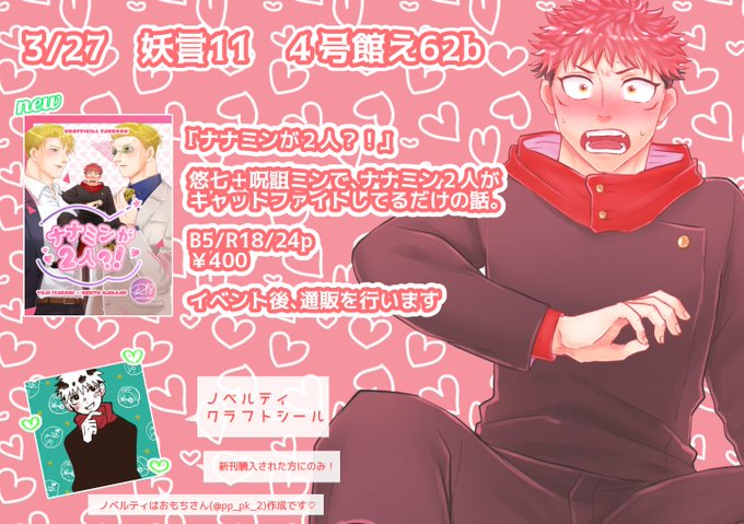 14 28 妖言11おしながきです~新刊と身一つで行くのでよろしくお願いします~! 新刊サンプル→pixiv.net/artworks/96895… #悠七オンリー 22/03/24 21:51