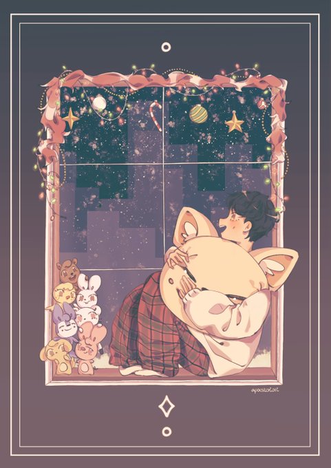 innie cuddling with foxiny around christmas themed decorations!! a lil secret santa gift for yan ehehe #straykidsfanart #IN