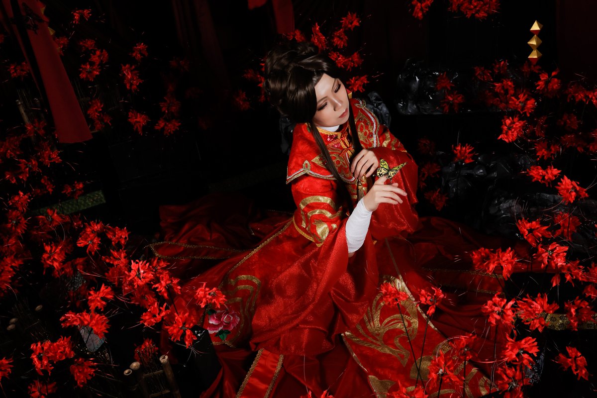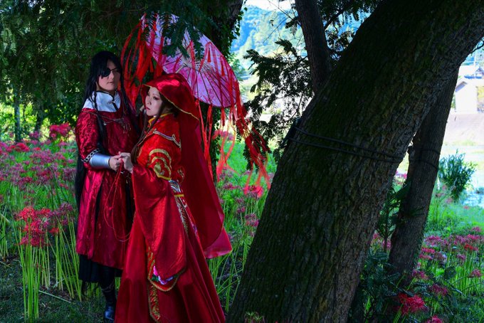 #今年一番気合い入れて作ったコスプレ衣装見せて 天官賜福の婚礼衣装かな! 布選びから質感やひらみを考え、柄も全て手で切り出して縫い付けてあります。 彼岸花を敷き詰めたスタジオで試し出しをして、その後彼岸花ロケに行く2段構えもしたくらいに気合いの入った1着となりました🥰🙌 twitter.com/aporochoco_non…