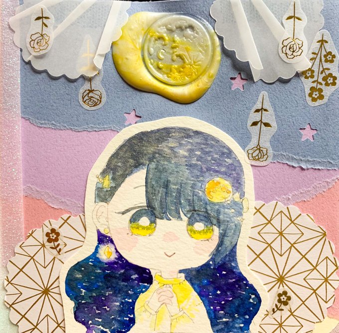 #コラージュノート #水彩 #イラスト好きと繋がりたい 月モチーフの女の子描きました✧*。٩(ˊωˋ*)و✧*。