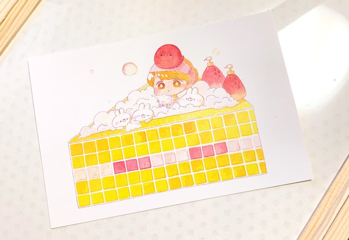 2 24 印刷所から刷り上がったポストカード届きました° ✧ (*´ `*) ✧ ° ケーキ風呂です\\\\٩( 'ω' )و //// #イラスト好きな人と繋がりたい #水彩 21/03/06 18:01