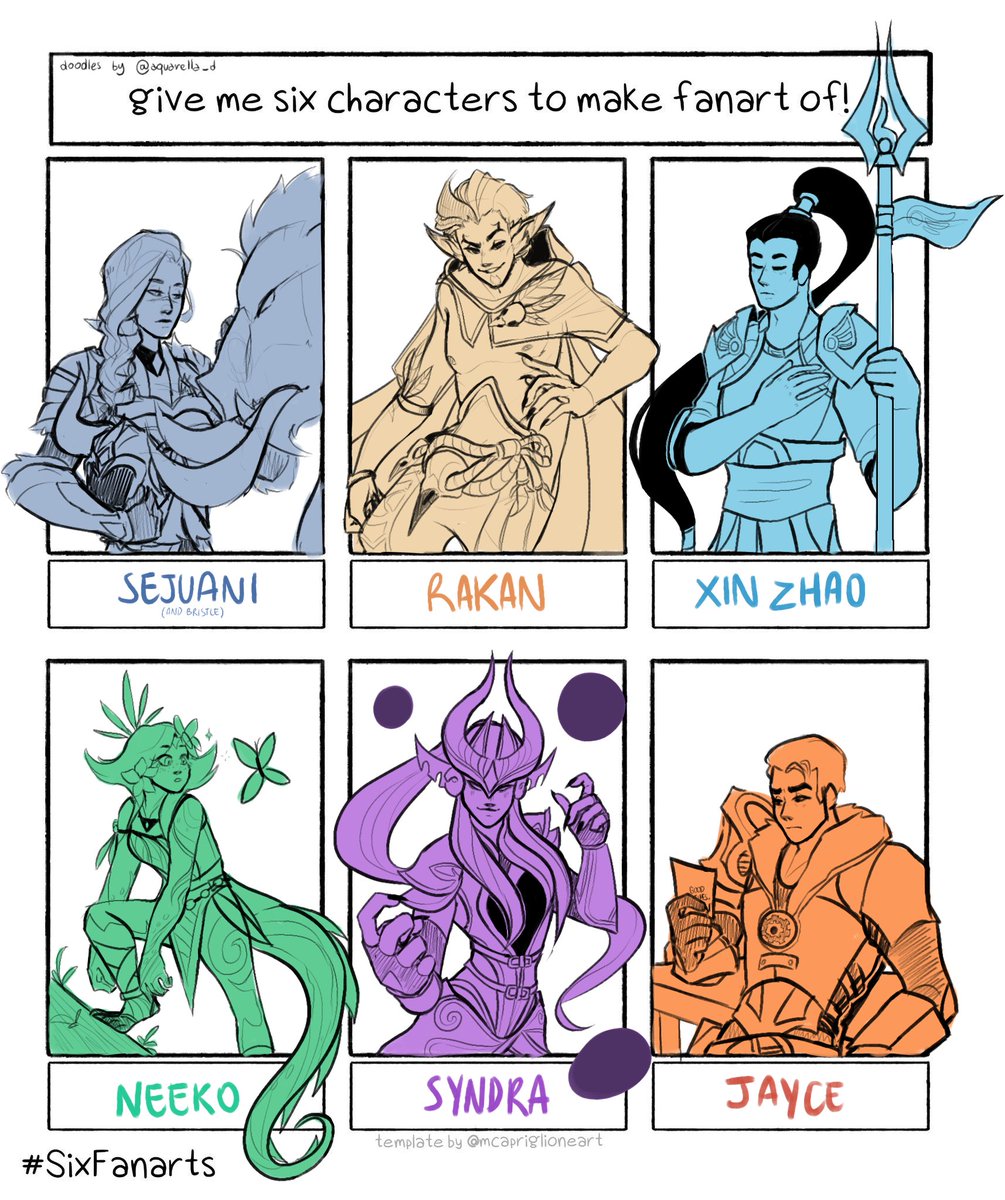 these were??? so much fun to do??? i'm. wow. i'm going to do this again. i know they're just colored doodles, but as i said, i needed to warm up and these were absolutely perfect akfosfk ty so much!! 💕 #Sejuani #Rakan #XinZhao #Neeko #Syndra #Jayce #ArtofLegends #SixFanarts