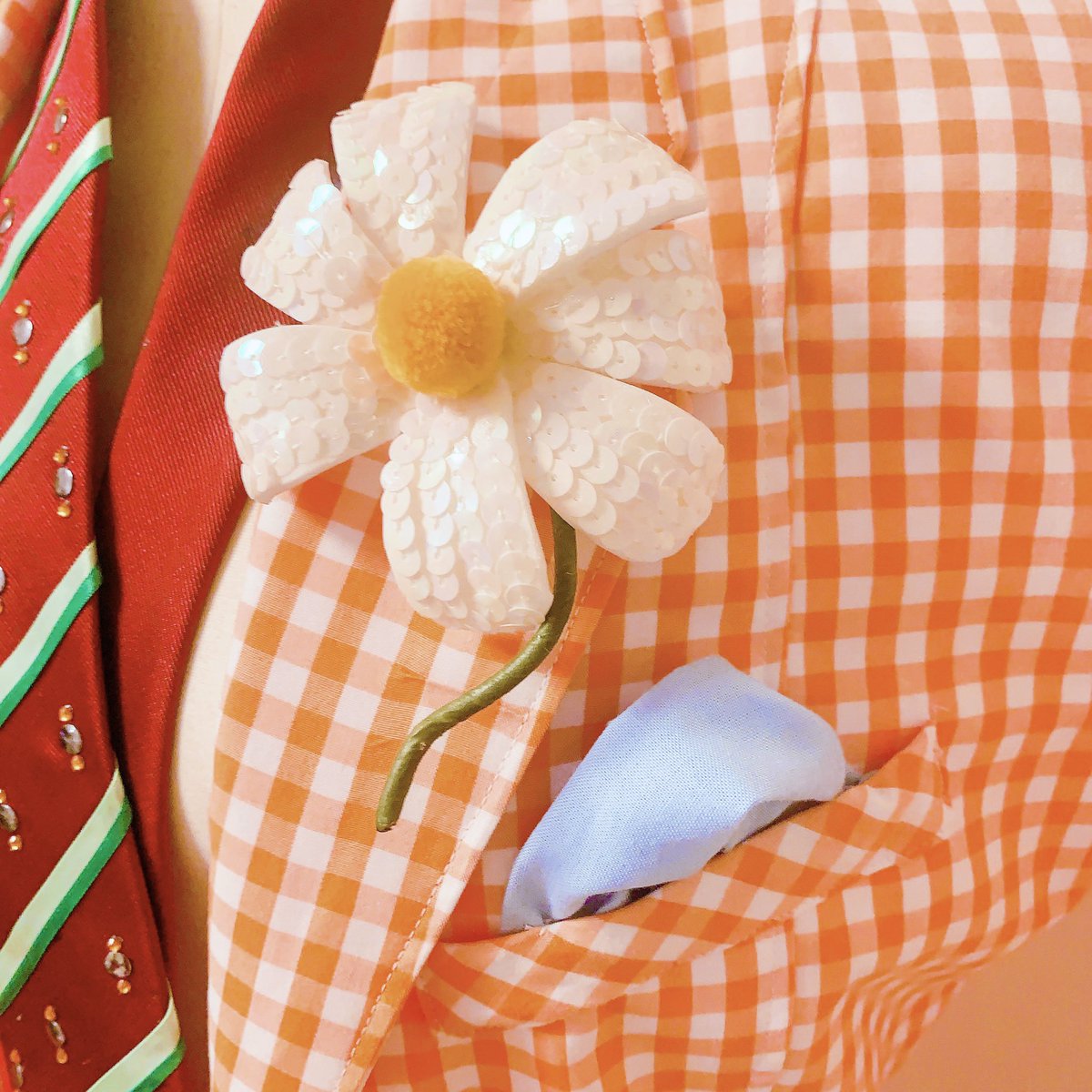 DAY DREAMの神宮寺レンの衣装の上半身作った〜☀️花弁7枚のマーガレットのコサージュもしっかりスパンコールでキラキラにした💪✨ 週末の夏インテでお友達に着てもらいます❣️最高の夏にするぞ〜!