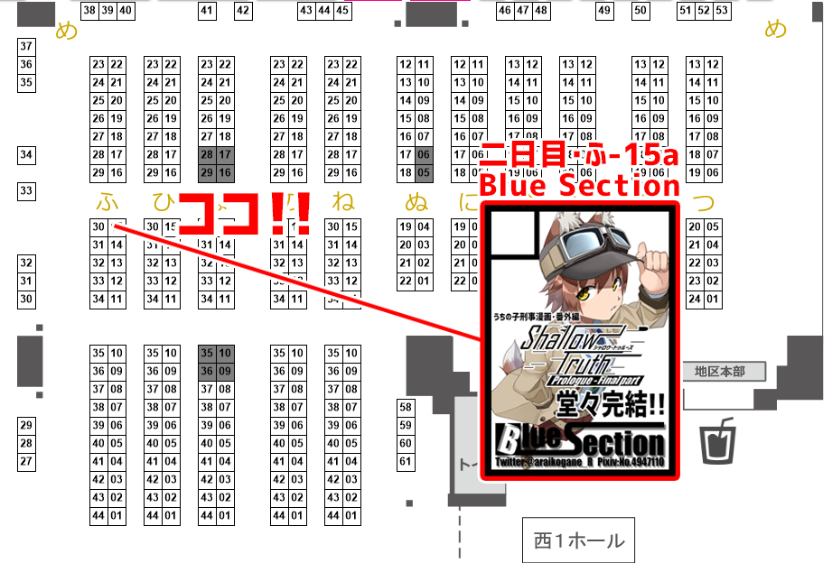 サークル「Blue Section」はコミックマーケット102で「日曜日 西地区 “ふ” ブロック 15a」に配置されました。 ↓コミケWebカタログにてサークル情報ページ公開中です。 webcatalog.circle.ms/Circle/Map/173… #C102WebCatalog