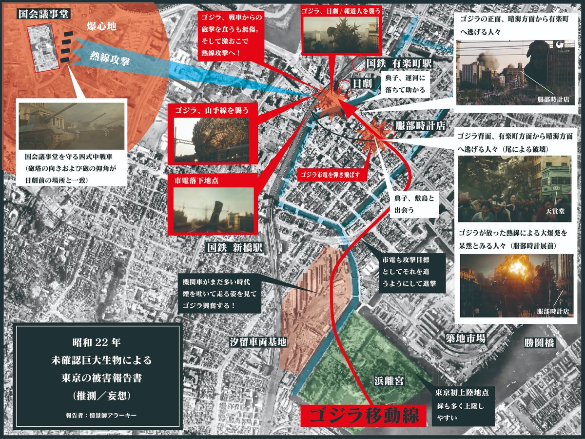 【ゴジラ vs 山手線】 映画「ゴジラ-1.0」にて銀座襲撃シーンまでの上陸経路を昭和22年の国土地理院の航空写真にマッピングして各シーン事の事象をマッピングした図です。… twitter.com/i/web/status/1…