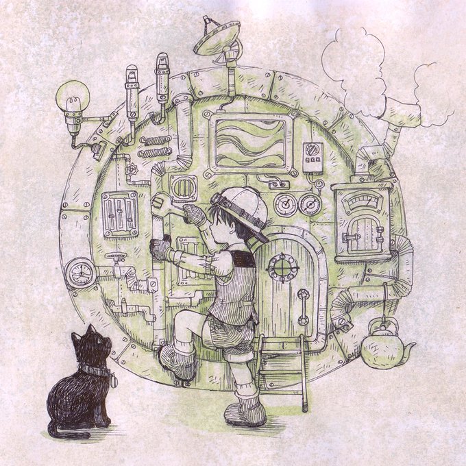 「猫のおうちの点検修理」 紙にダメージ加工して描いてみました。 味が出て面白いです。 #art #illust #illustration #drawing #アート #イラスト #イラストレーション #アナログイラスト #アナログ絵 #ペン画 #ボールペン #ボールペン画 #ballpointpen #ballpointpenart #スチームパンク #steampunk