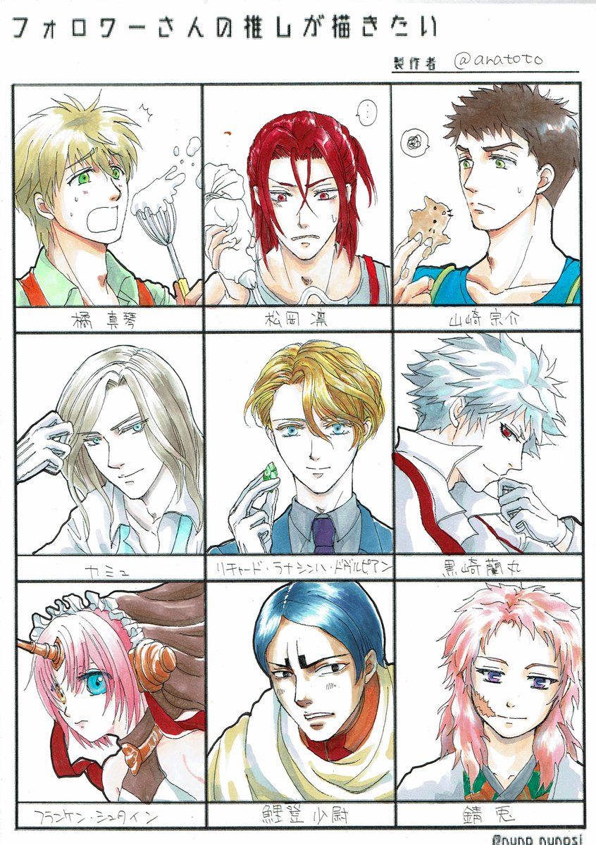 まこちゃん@yomu3u 凛ちゃん@utukiiii ちゅけ@Hs66G カミュ様@nagism625 リチャ様@ha_jime_TandB 蘭丸@yasukoban405 フランちゃん@coto_rinrin 鯉登少佐@ahlyahly 錆兎@umanomousigo 描かせてくれてありがとう~ アナログスキャンしたら色ダイナシ~ #フォロワーさんの推しが描きたい