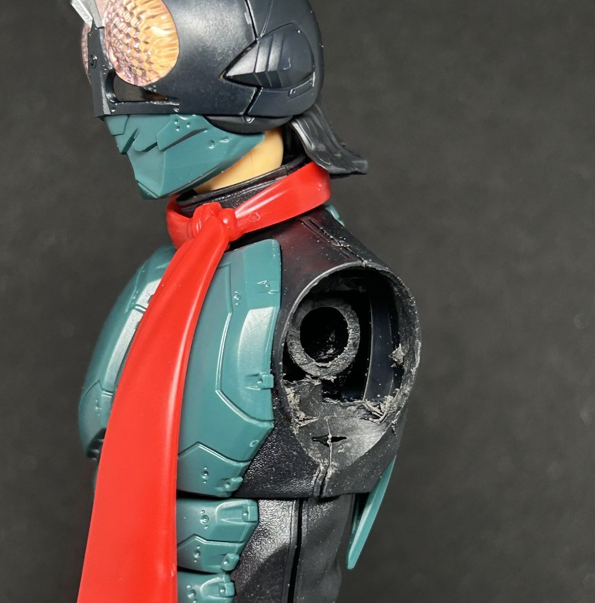 昨日見て熱気冷めやらぬ勢いでフィギュアライズのシン仮面ライダー1号買って早速改造。 マスクの形状修正は時間かかるのでひとまず気になっていた肩幅修正。 パッと見て脇が絞められないのが原因なのはわかっていたのでリューターで鑑賞部分を削って奥までハマる様に。