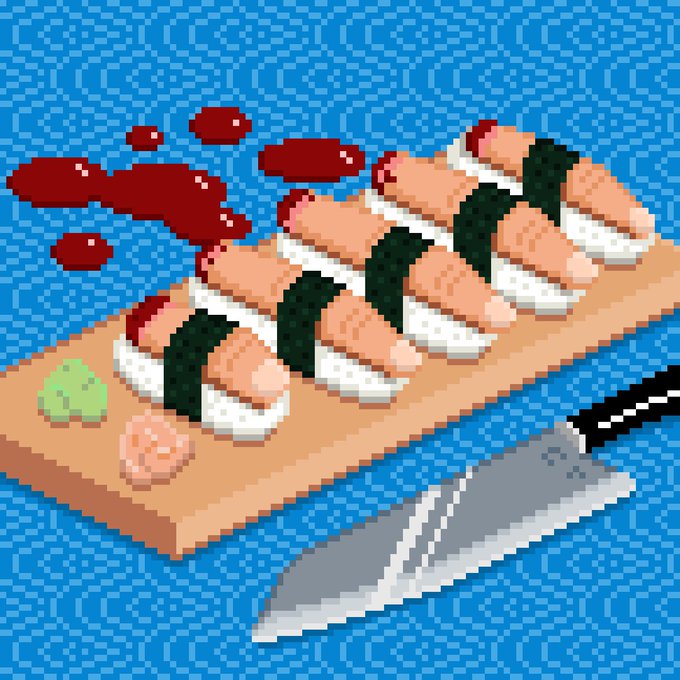 Octobit 2022: 03 - Splatter Is sushi actually finger-food? (Inspired by guro masterpiece “Machine Girl”) #splatter #guro #sushi #octobit22 #octobit #octobit2022 #pixeltober #pixeltober2022 #dailyart #pixel_dailies #pixelart #8bit #16bit #pixel #lofi #videogame #arcade #ドット絵