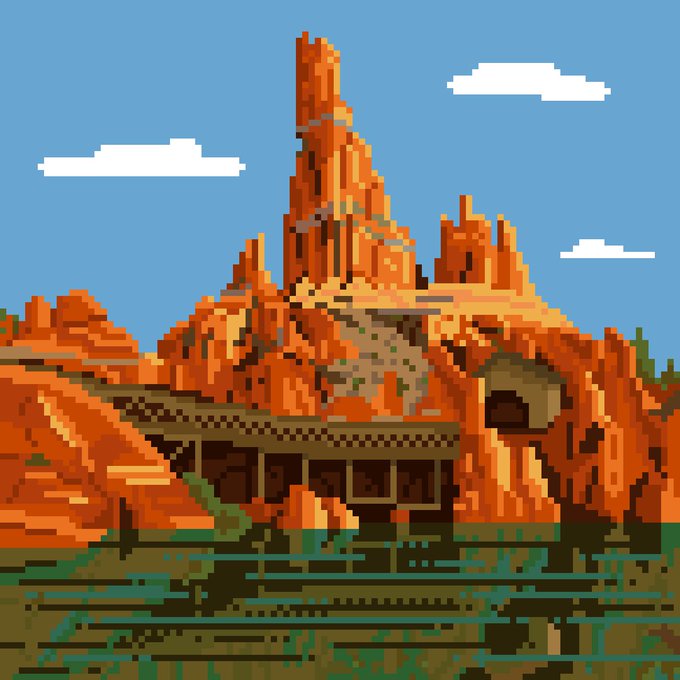 Octobit 2022: 06 - Gold Mine Big Thunder Mountain, the Disneyland Paris version. #bigthundermountain #disneylandparis #disneyparks #frontierland #disneyland #octobit22 #octobit #octobit2022 #pixeltober #pixeltober2022 #inktober #inktober2022 #dailyart #pixel_dailies #pixelart