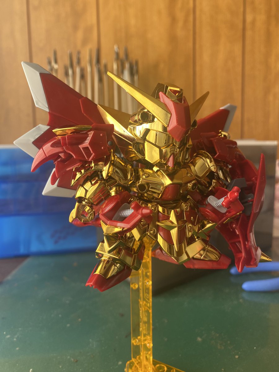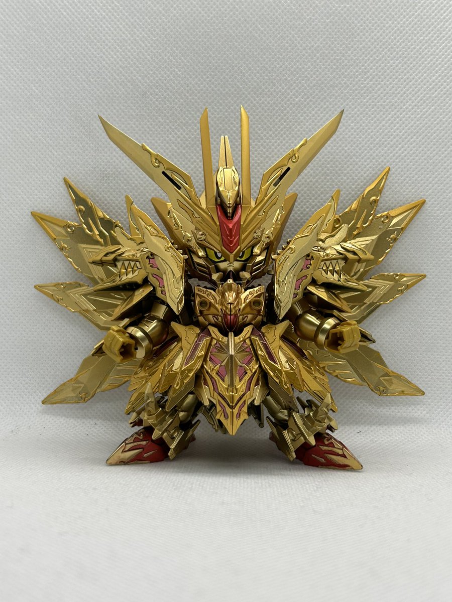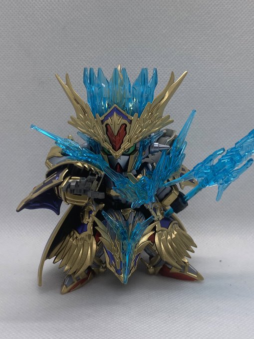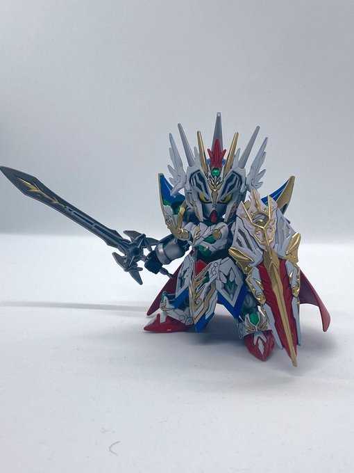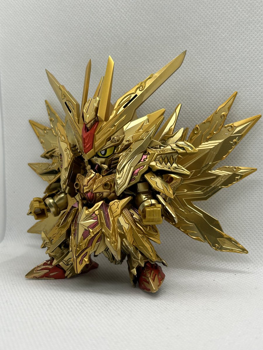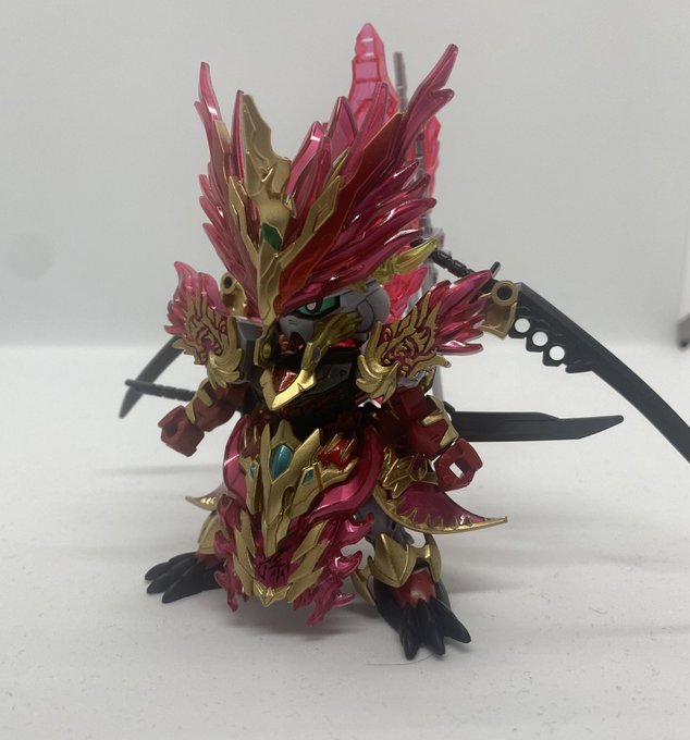 #俺SD作ってるぜ #ガンプラ #ガンプラ好きと繋がりたい 孫権アストレイ 赫炎翔虎 完成 クリアパーツは今回は裏からシルバーを吹くパターンで作成。 両肩のレリーフはマスキングできる気しなかったのでスポンジで軽く叩いて塗装。基本は凸部分だけ塗れるので、はみ出たところをマジックリンで修正。