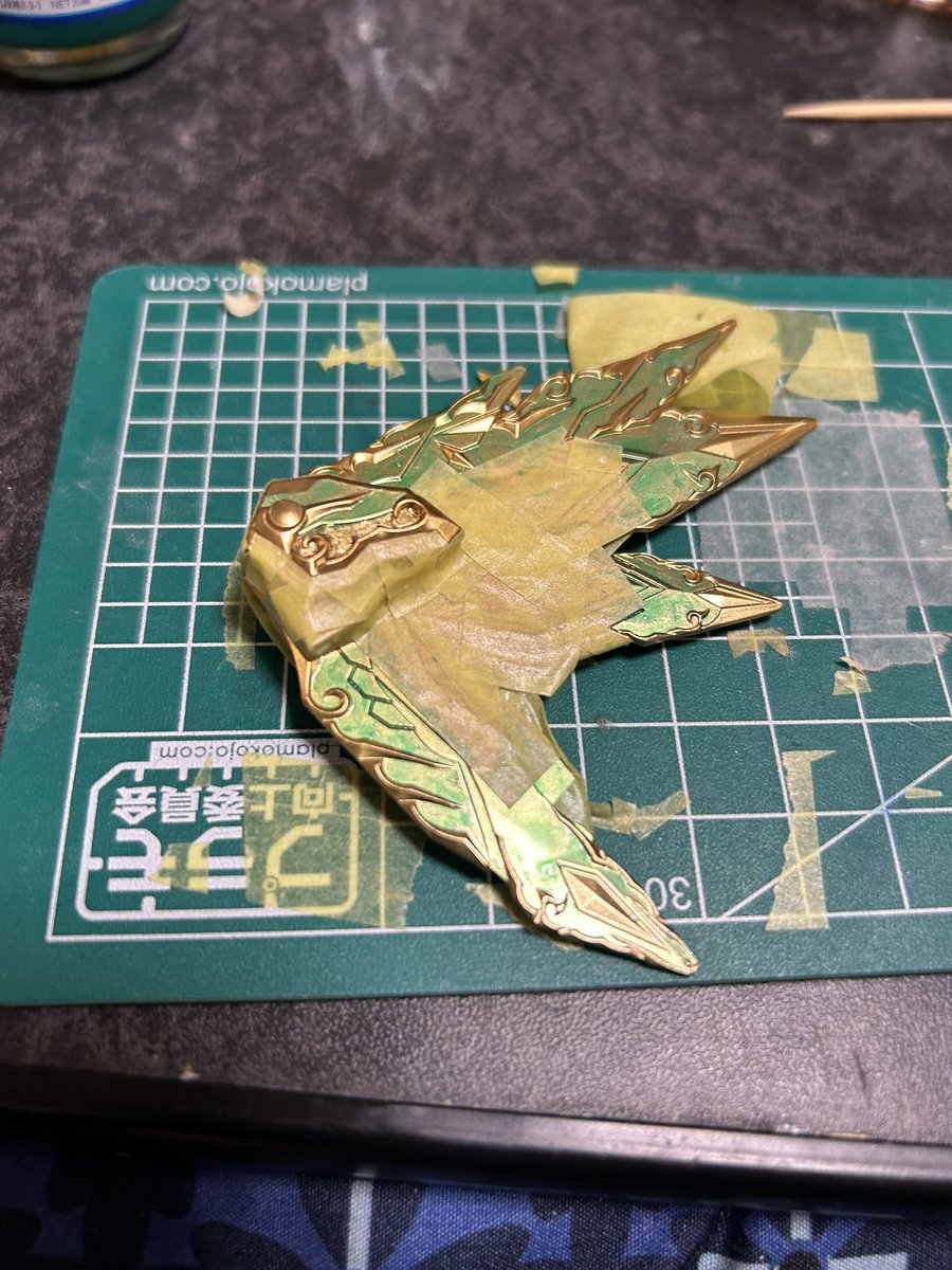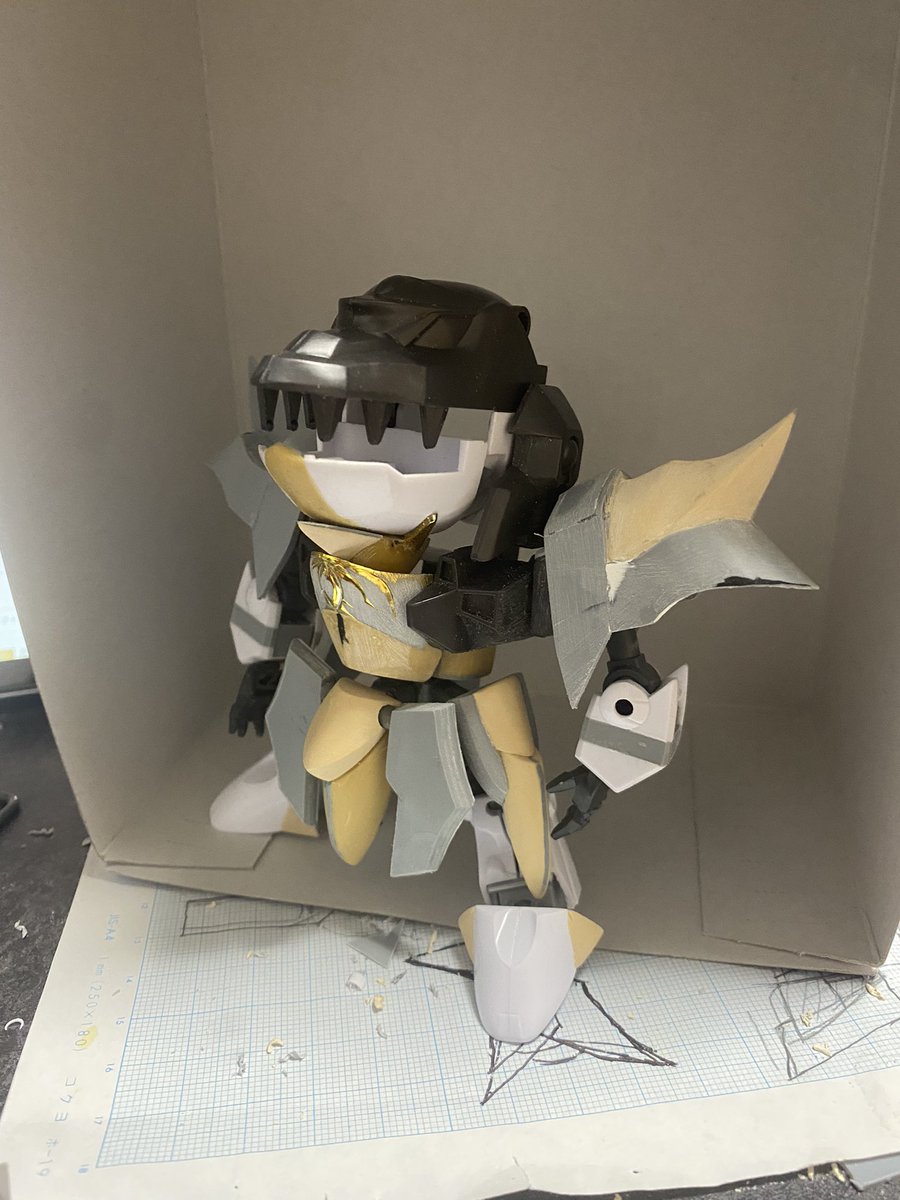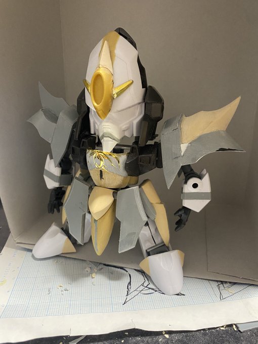 #俺SD作ってるぜ #ガンプラ #ガンプラ好きと繋がりたい #スペリオルドラゴン スペリオルドラゴンZ③ 腰の鎧を制作。 プラ板積層のパーツが多いんだけど、せっかちなので接着剤乾き切る前に加工してしまって、表面が荒くなってる。😓 粗でパーツを作っている状況だけど、良いペース。