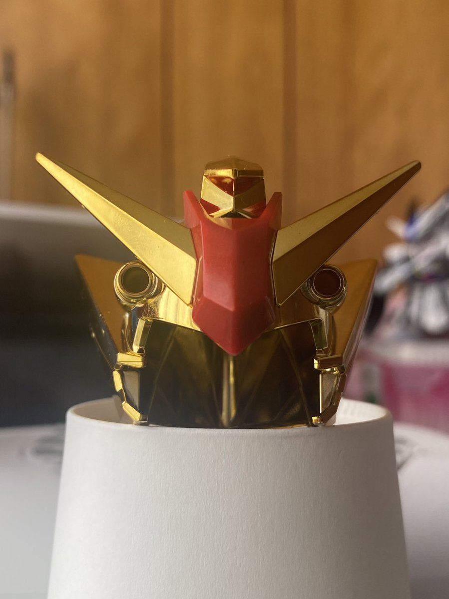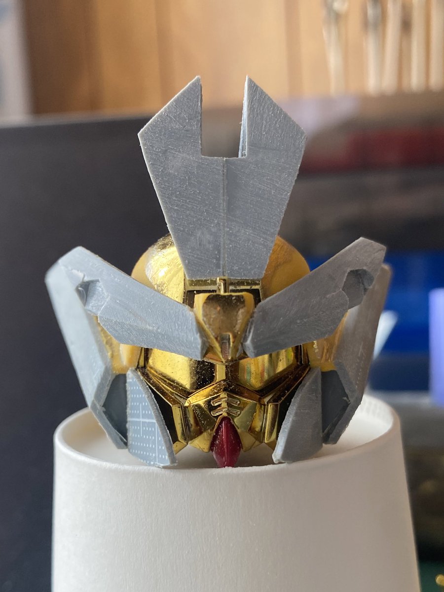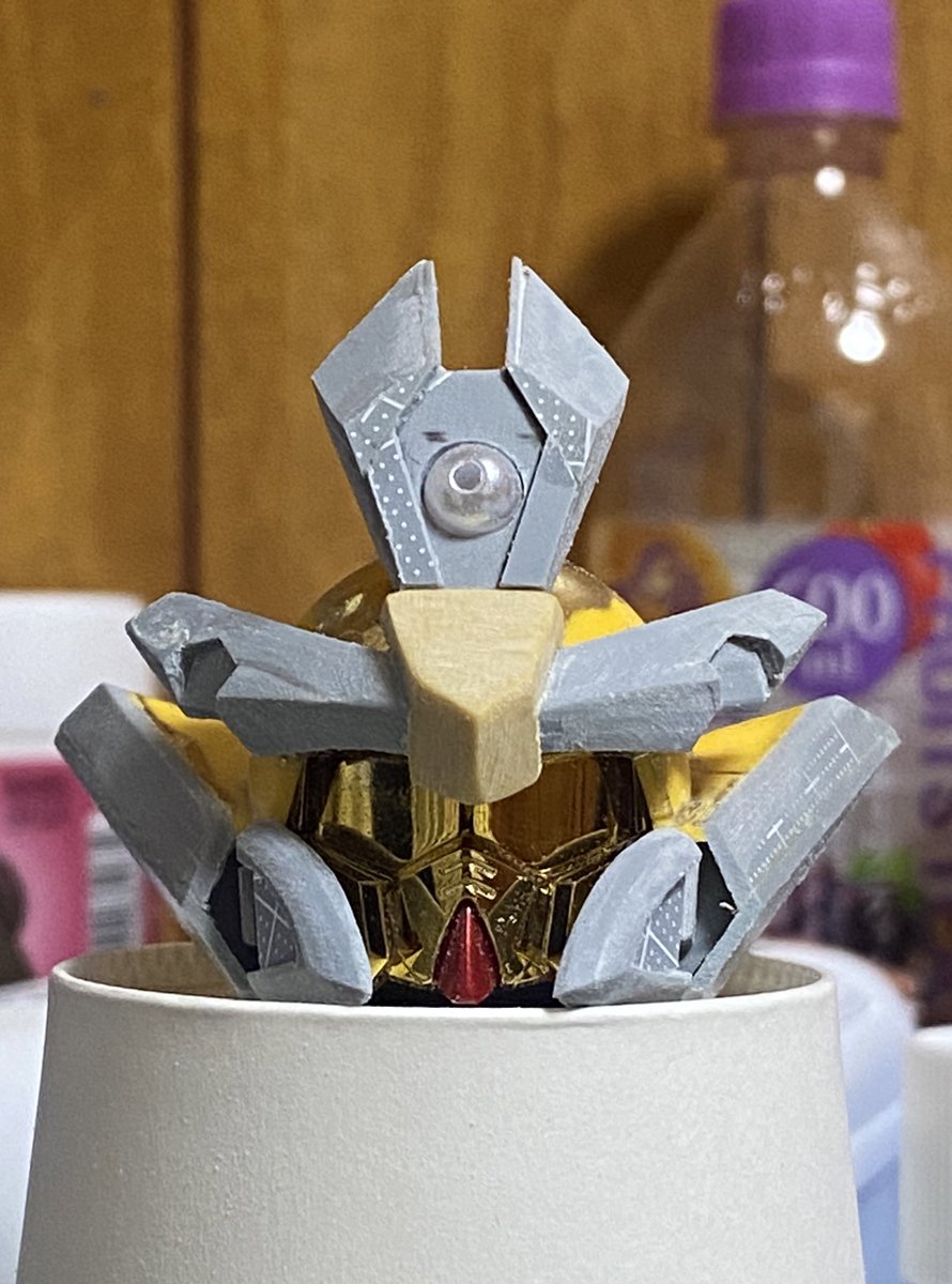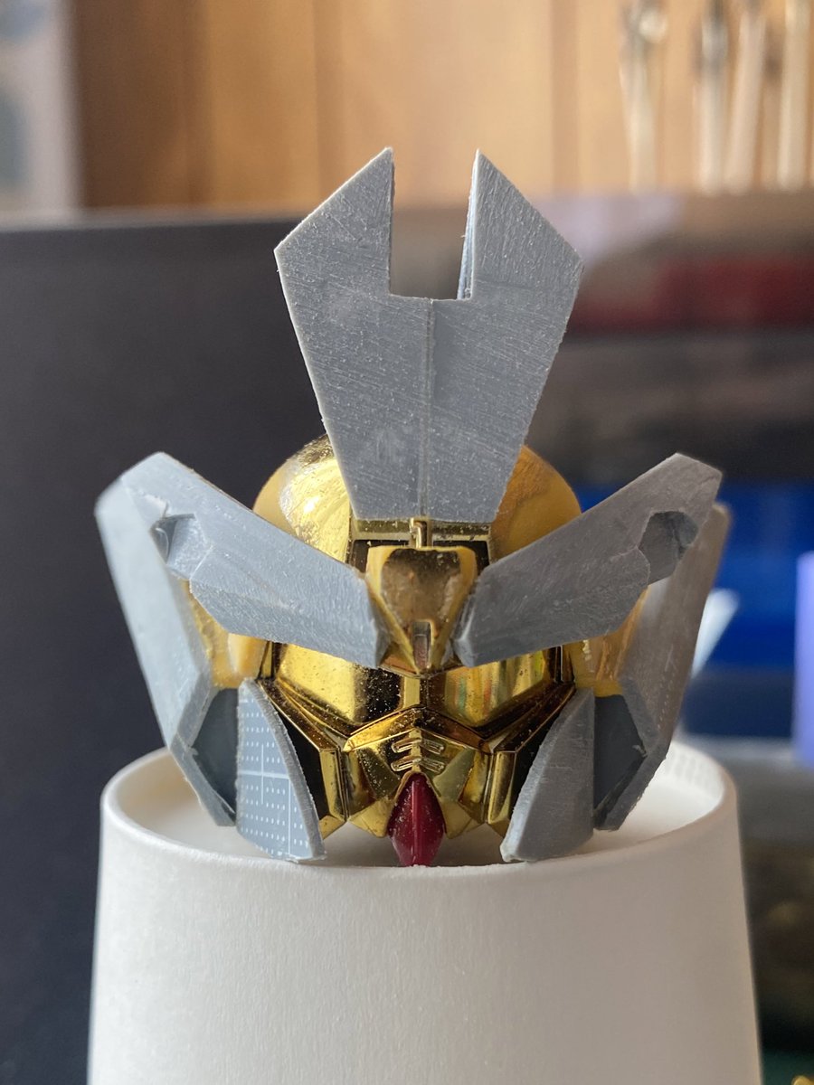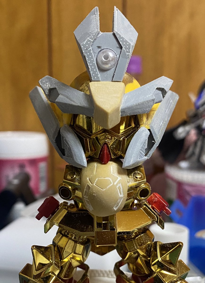 #俺SD作ってるぜ #ガンプラ #ガンプラ好きと繋がりたい スペリオルドラゴンZ② 引き続き頭の改造。 一枚目は前回。二枚目が改造後 頬のパーツは角度が気に入らなかったので作り直し。額の玉は100均の6mmビーズを使っていますが8mmに変更する予定。 後は胸をパテ盛ってディテール追加しました。