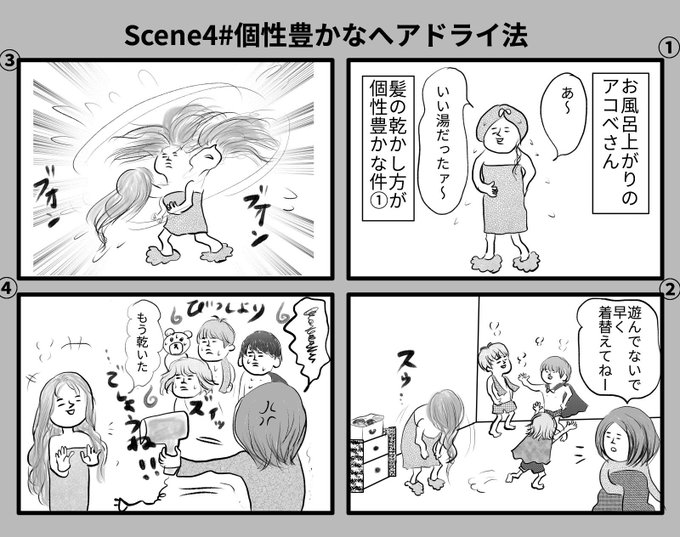 1 0 第④話 個性豊かなヘアドライ法 #漫画 #4コマ漫画 #がんばれ母さん #育児は忍耐 #漫画が読めるハッシュタグ 22/12/07 11:38