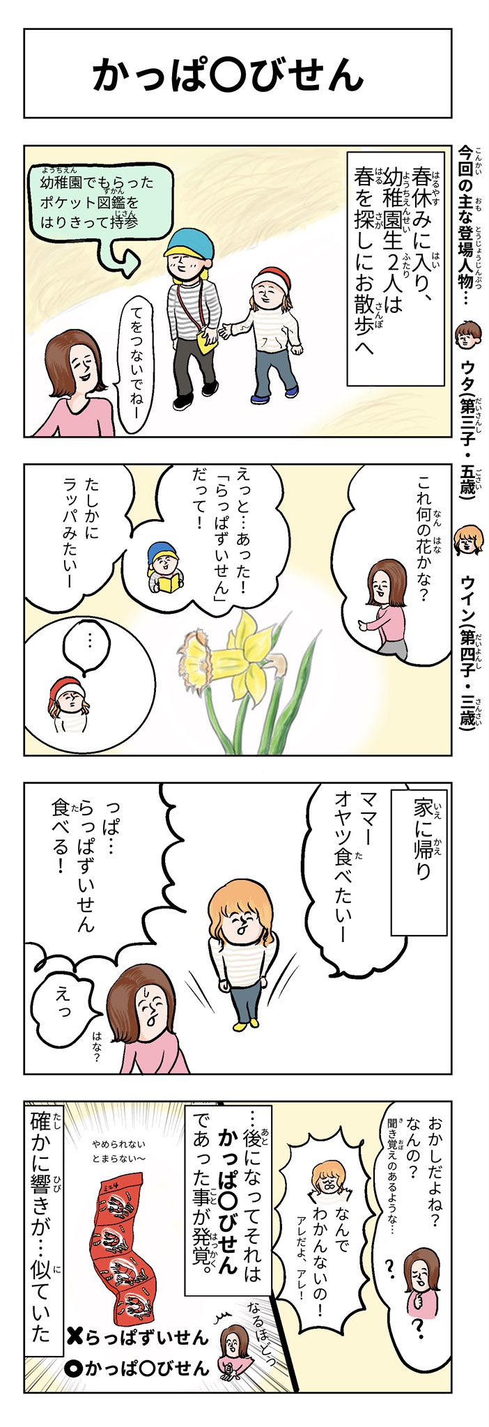 タイトル<かっぱ○びせん> #コミックエッセイ #漫画がよめるハッシュタグ #育児漫画 #育児絵日記 #育児エッセイ #4コマ漫画 #いいまちがい #らっぱずいせん #かっぱえびせん #三歳 #五歳 #散歩 #4コマ母道場