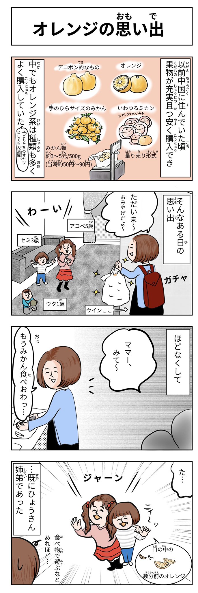 タイトル<オレンジの思い出> #オレンジデー #オレンジの日 #コミックエッセイ #育児絵日記 #育児漫画 #エッセイ漫画 #漫画が読めるハッシュタグ #4コマ漫画 #育児エッセイ #果物 #みかん