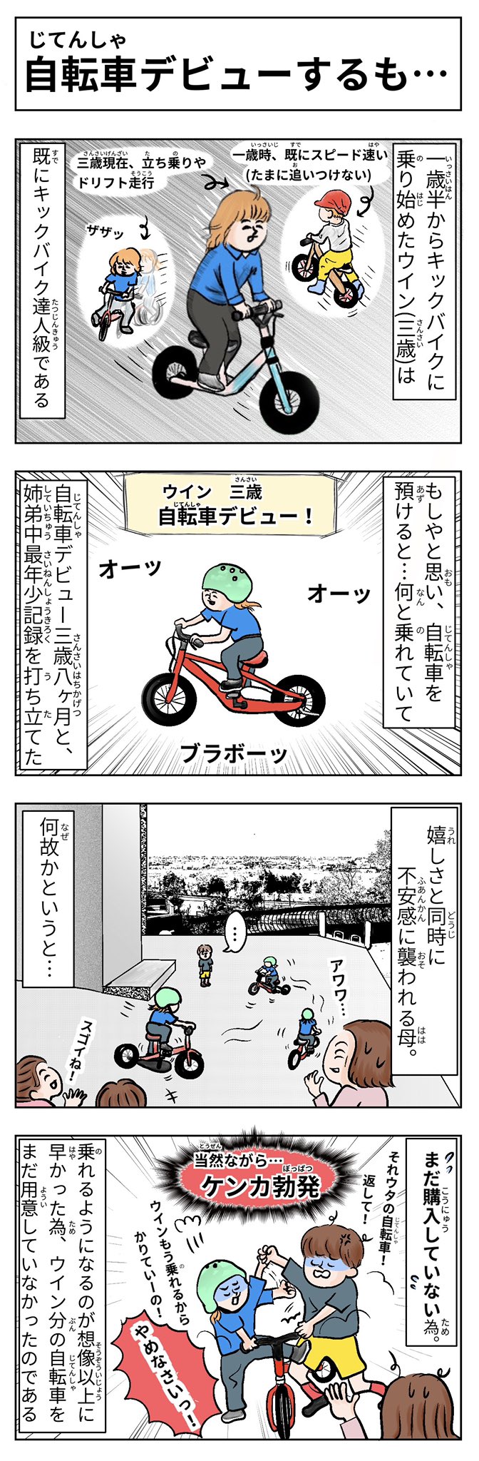 タイトル<自転車デビューするも…> #コミックエッセイ #育児絵日記 #漫画がよめるハッシュタグ #漫画が読めるハッシュタグ #育児漫画 #育児エッセイ漫画 #四コマ漫画 #4コママンガ #3歳 #5歳 #けんか