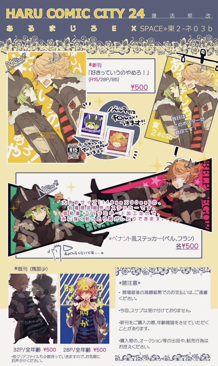 26 79 HARU COMIC CITY24(復活祭改8)のお品書きです!フラベルしかないです...( ᷇࿀ ᷆ ) 日曜日はネ03bでお待ちしております、どうぞよろしくお願いします〜!💚💛 19/02/21 23:06
