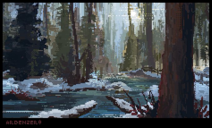 Hi I like to do illustrative experimental #pixelart of weird things in my brain and also impressionist landscapes inspired by hiking around the Pacific Northwest. #PortfolioDay