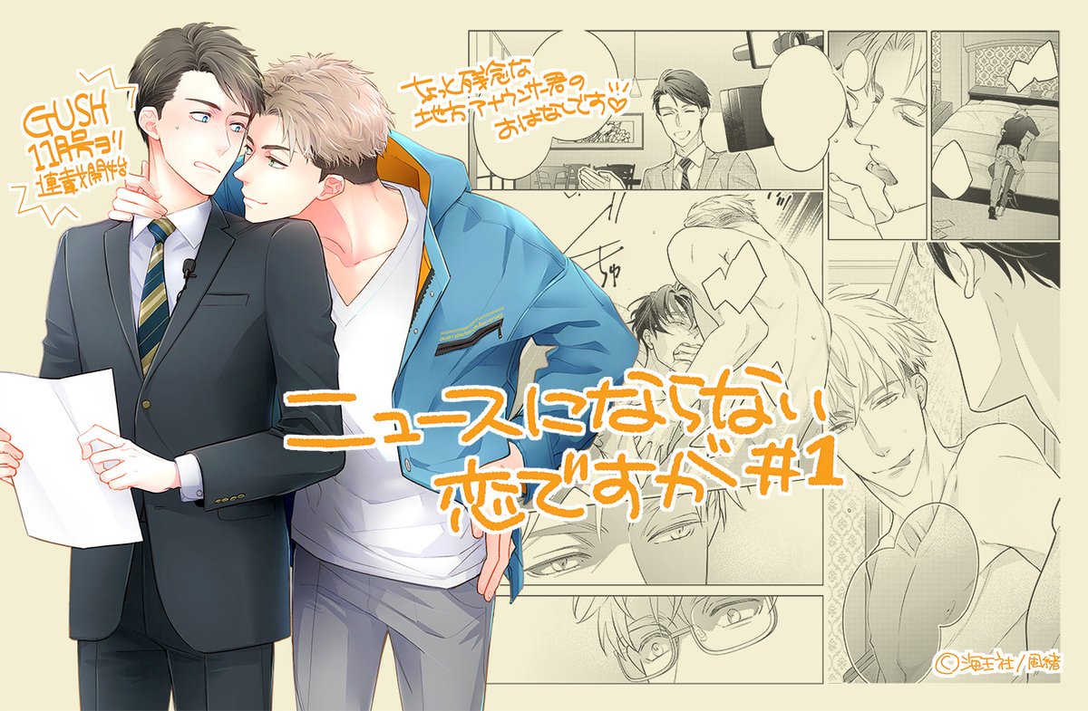 24 172 【お仕事宣伝】10/6発売「GUSH 11月号/海王社様」にて「ニュースにならない恋ですが」P32+扉カラーで新連載開始です☺️ 隔月連載でがんばります〜! 色々残念な地方局アナ君、曰く付きの恋。今回はカラーラフギャラリーにもお邪魔しました。どうぞよろしくお願いします💕 22/10/06 07:49