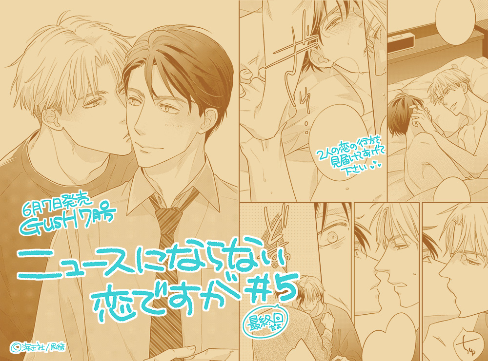 21 102 【お仕事宣伝】6/7発売「GUSH 7月号/海王社様」にて「ニュースにならない恋ですが」第5話(最終回)P32掲載です。色々残念な地方局アナ君の曰く付きの恋。拗れた二人の恋の行方を見届けてあげてください。 どうぞよろしくお願いしまっす💖 23/06/07 10:00