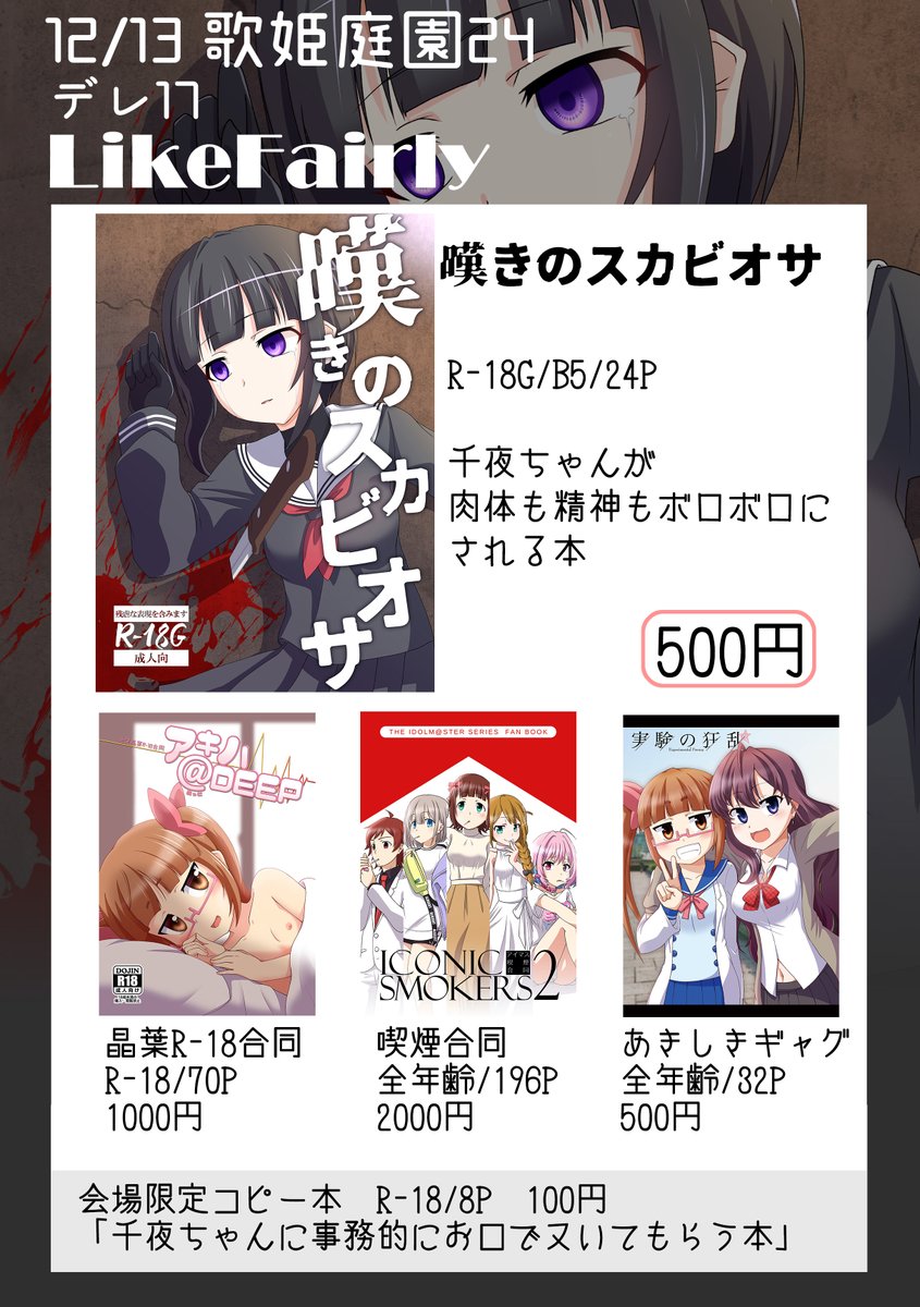 30 23 12/13、大田区産業プラザPioにて開催される歌姫庭園に当サークルも参加しますー!おしながきはこちら!人を選ぶ本ではありますが、デレ17「LikeFairly」をよろしくね! 20/12/01 18:16