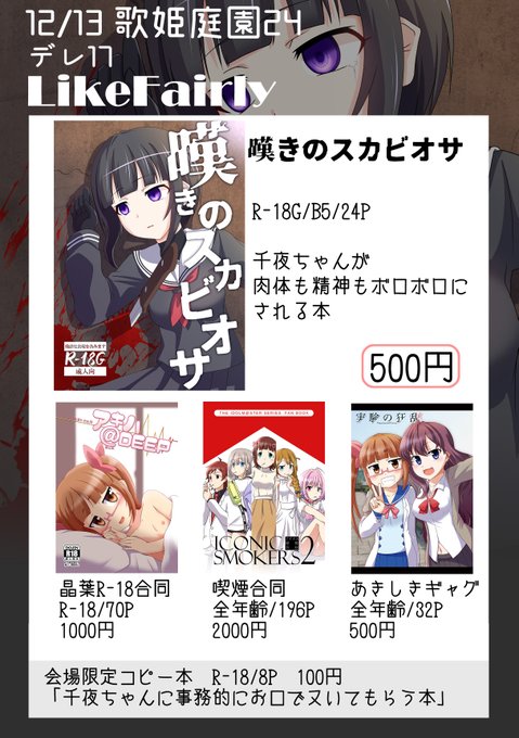 12/13、大田区産業プラザPioにて開催される歌姫庭園に当サークルも参加しますー!おしながきはこちら!人を選ぶ本ではありますが、デレ17「LikeFairly」をよろしくね!