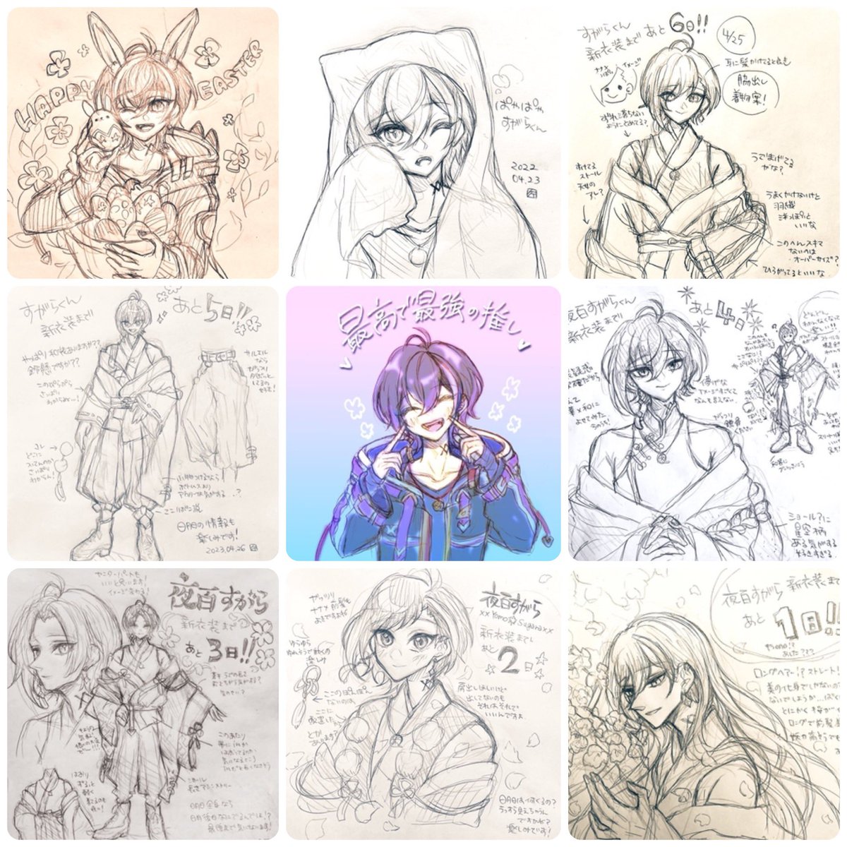 0 2 月初めは中々線画まで辿り着けず難航してたのに、後半の方は怒涛の推しくんの供給ラッシュで狂ったように新衣装考察描いてましたッ😂✨ #今月描いた絵を晒そう 23/04/30 19:58