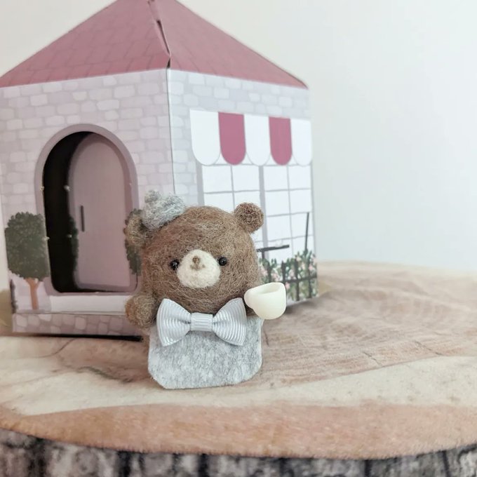 くまのカフェを作ってみました。ほっこりするお顔になったかなー?カップではじめて樹脂粘土使いましたけど、よく伸びておもしろーい!!樹脂粘土もやってみたくなりますねえ☺️ #羊毛フェルト #ハンドメイド好きな人と繋がりたい