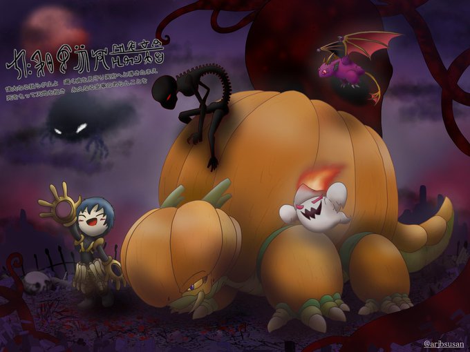 本日はハロウィン当日ということで、先日紹介したハロウィンイラストに登場したモンスター達の一口紹介です。 本日の主役ともいえるモンスター、パンプゴンは久しぶりの出番に合わせて、デザインをリメイクしています。 #ハロウィンイラスト