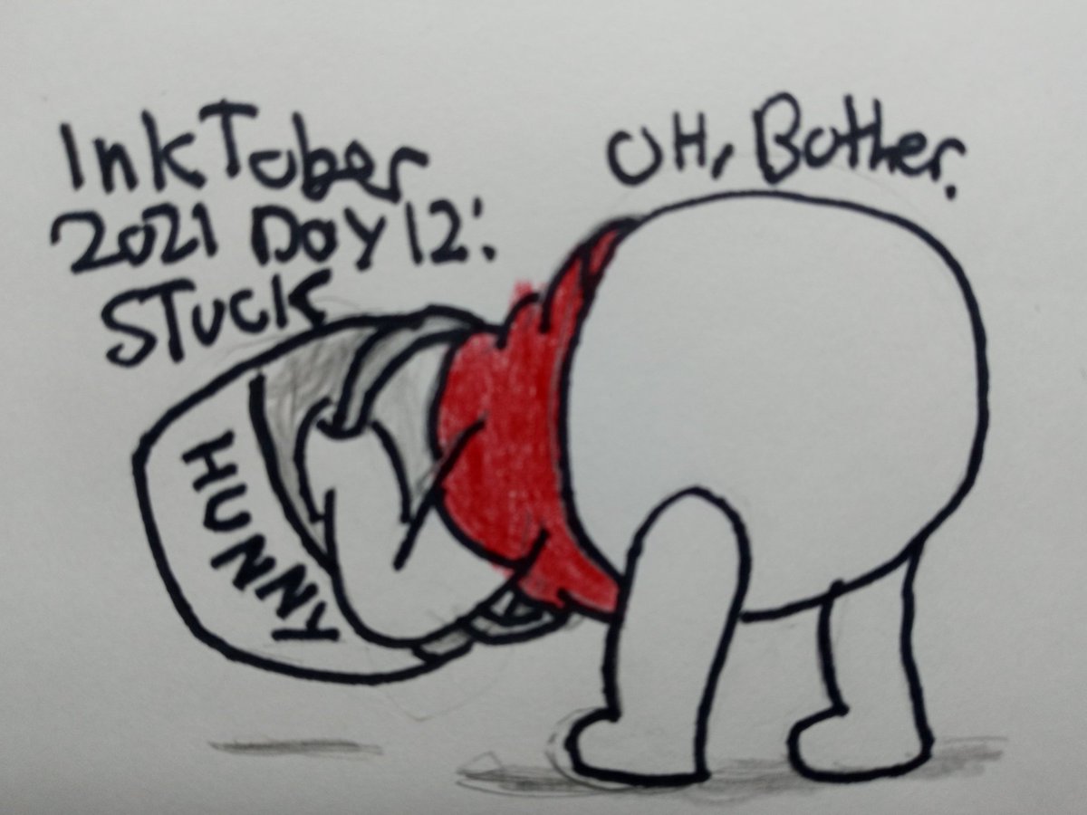 Inktober 2021: Day 12: Stuck. Pooh becomes hungry. he remembers that there's honey in the trap, but finds there's some honey in the jar, meaning that he has to stick his head inside the jar. He gets his head stuck in the jar. #Inktober #inktober2021 @inktober #Inktober2021day12