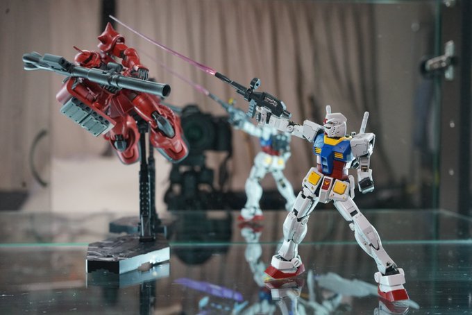 ガンダムvsシャアザク 初期は言わずとしれたあのポーズ シャアザクはそれっぽく ライフルにビーム刺しゃ それなりに見える #ガンプラ #ガンプラ好きと繋がりたい #ガンプラの画像貼るとRTされると聞いて #ガンダム #シャア専用ザク