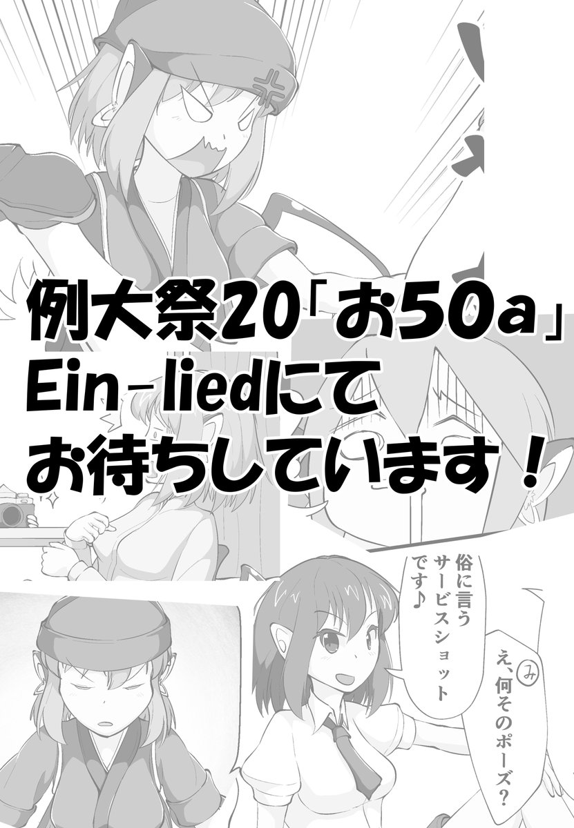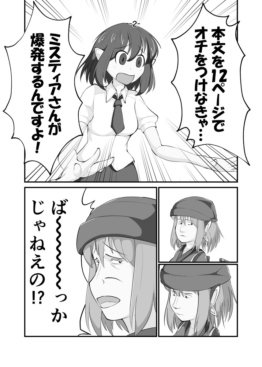 5/7(日)開催の博麗神社例大祭新刊サンプルです! 「本文12ページでオチつけないとみすちーが爆発する話」 タイトル通りの頭の悪いギャグ本です! 本文16P500円! お50a「Ein-lied」にてお待ちしております!!!! #例大祭20 #ミスティア・ローレライ #東方