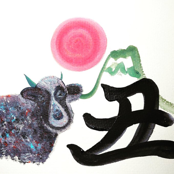 2 6 🎍謹賀新年🎍 明けましておめでとう御座います今年も宜しくお願い致します🤲🌈 2021年は、あなたにとって モー笑っちゃうくらい 楽しく素晴らしい一年に なりますように✨☺ #丑 #ウシ #新年 #あけましておめでとうございます #happynewyear #art #アート #アクリル #水彩 #original #日の出 21/01/01 17:36