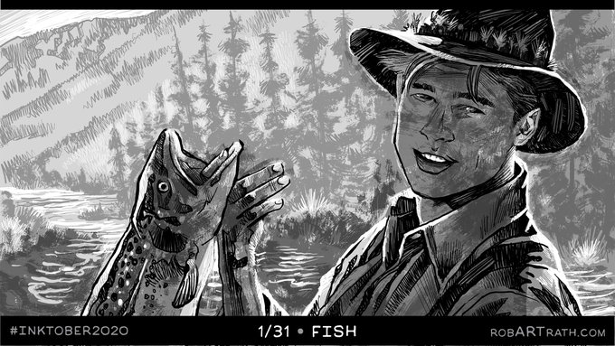 Okay, going to give Inktober a shot! Day 1 • Fish Thanks to Kyle Webster's Harring/Vinyl Scrape brush #inktober2020 #Inktober #AdobeFresco #BradPitt @kyletwebster @adobefresco @Adobe @furfishgame @FieldandStream