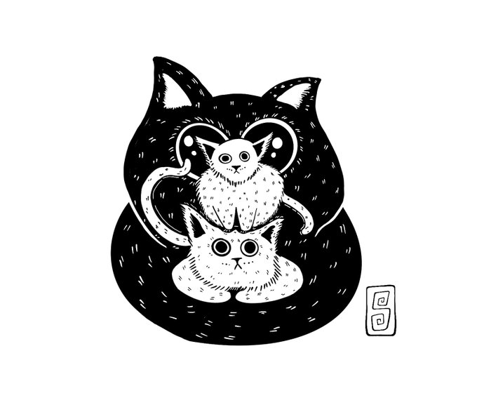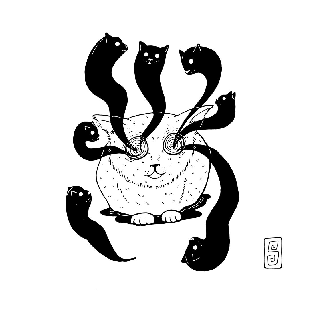 Inktober 6, Spirits. @inktober A loafing kitty with spirit cats coming out of its own eyes or a vision with support of spirit kitties. #inktober #inktober2021 #inkdrawing #inkart #penart #drawing #drawings #draw #dailyart #art #illustration #digitalart #cat #kitty #catart