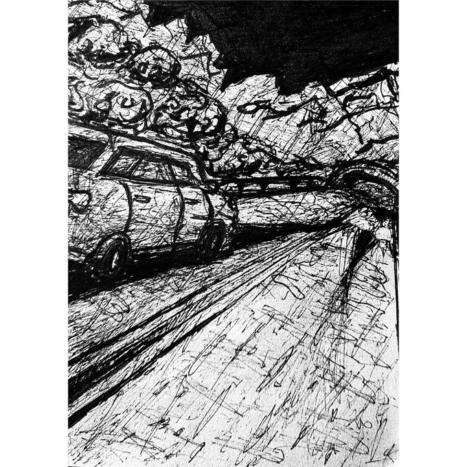 Inktober 2020, day 12 - "SLIPPERY" . Not too sure about this one, lemme know what you think . . . . . @inktober @jakeparker #inktober2020 #inktober #art #illustration #drawing #draw #sketch #pencil #artwork #slippery #wet #roads #mountains #headlights #night #ride #drive