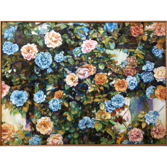 #10年前の絵と最近の絵を晒す 青とうすピンクとかの薔薇たちの油絵が10年以上前。ピンクの一輪の薔薇水彩画が一番最近の絵。 気持ち明るくなってきた気がする🙂 #絵画 #薔薇 #油絵 #水彩画