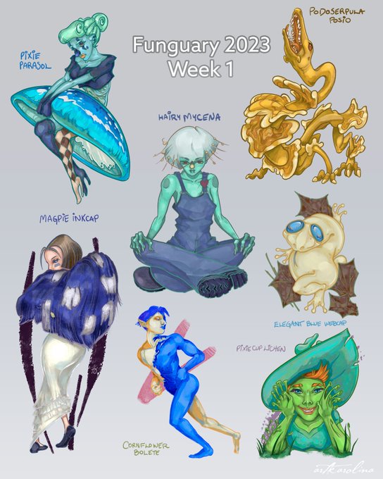 I survived one week of Funguary x_x I think the designs got better a lot faster. I started with the Inkcap & Bolete. I think in the next week you'll probably see more clowns. I may post these with little facts on my site blog/Patreon #artwork #sketchbook #fantasyart #gothic #art