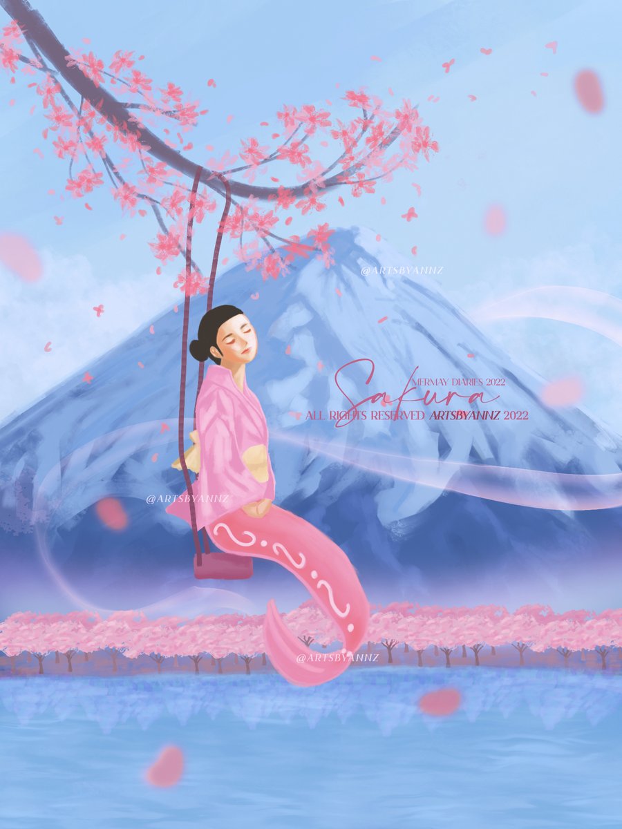 Sakura. second #mermay piece for this year. i've always wanted to draw mt. fuji and always thought that cherry blossoms are perfect combo for it! and with mermaids! do you want to swing with a beautiful view of japan like this, too? ~ interactions are highly appreciated! #art