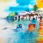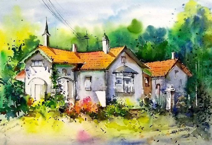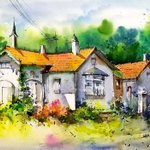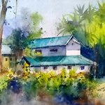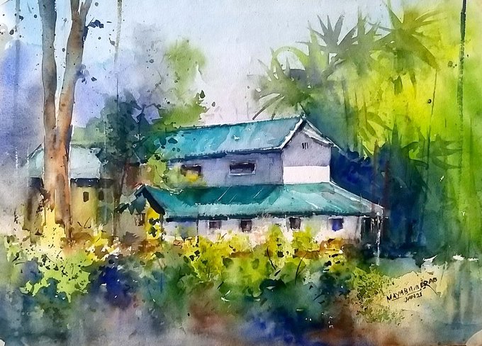 Nestled amongst the tall palm trees, is a cozy townhouse, sheltered by blue roofs, designed to drown out the rains frequent to the area. #karnataka #India #Watercolor #watercolorpainting #paintingoftheday #art #artvsartist2021 #artwork #Houses #palm