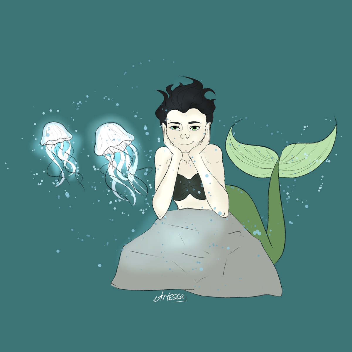 🧜♂️MERMAY 2021🐚 [Day 28: Obsessed] Can't stop watching those glowing jellyfish🤩 #mermay #mermay2021 #ArtistOnTwitter